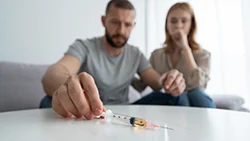 Мужчина сидит на диване и тянется за шприцом, рядом сидит шокированная женщина